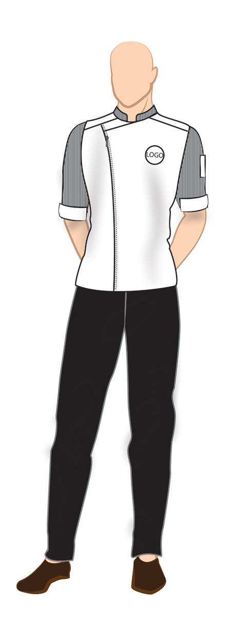 one fold half sleeve stand collar overlapping White chef jacket with zipper closure, pen pocket on left sleeve and black trousers