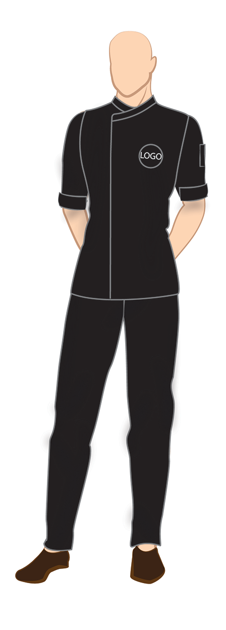 folded half sleeve overlapping black chef jacket, pocket on sleeve, invisible buttons and black trousers