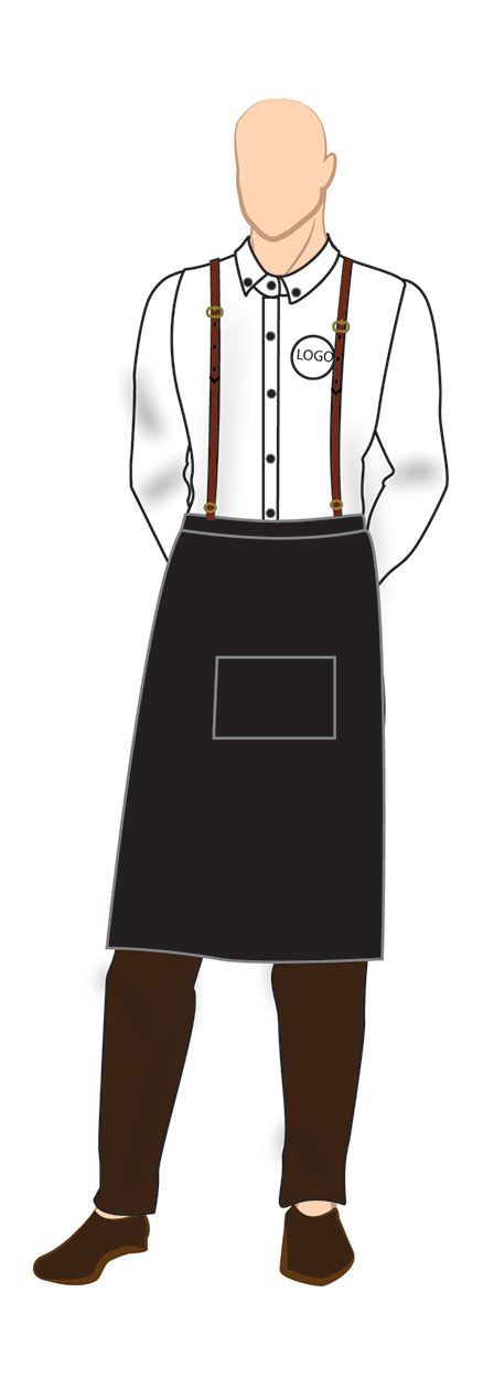 Full sleeve white button down shirt with trousers and half apron with single center pocket and suspenders