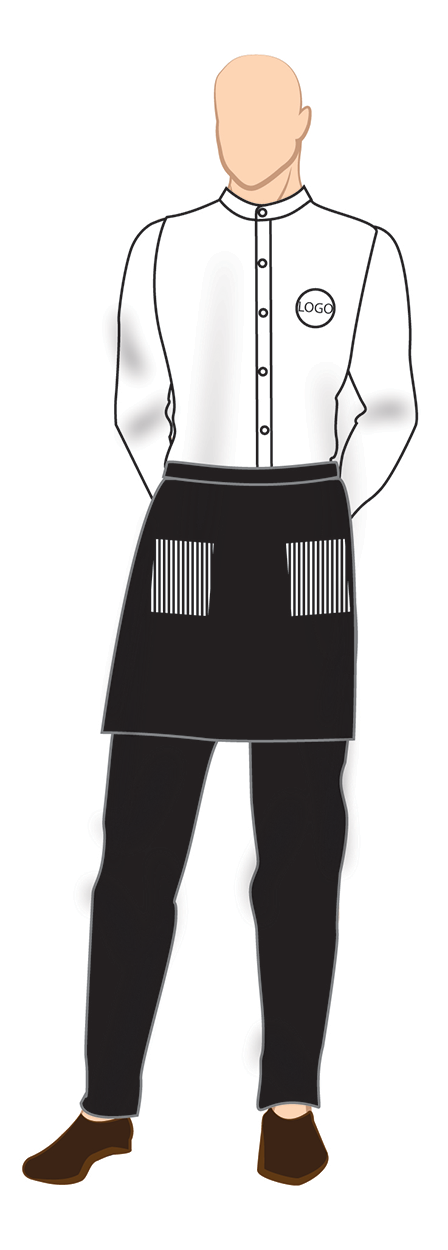 Full sleeve black stand collar shirt with trousers and half apron with center pocket
